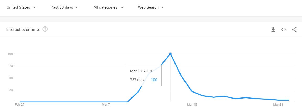 来自谷歌趋势的数据表明,在过去的一个月里,以“737 max”为检索词的搜索量自3月9日开始,到3月13日达到高峰,然后缓慢下降。